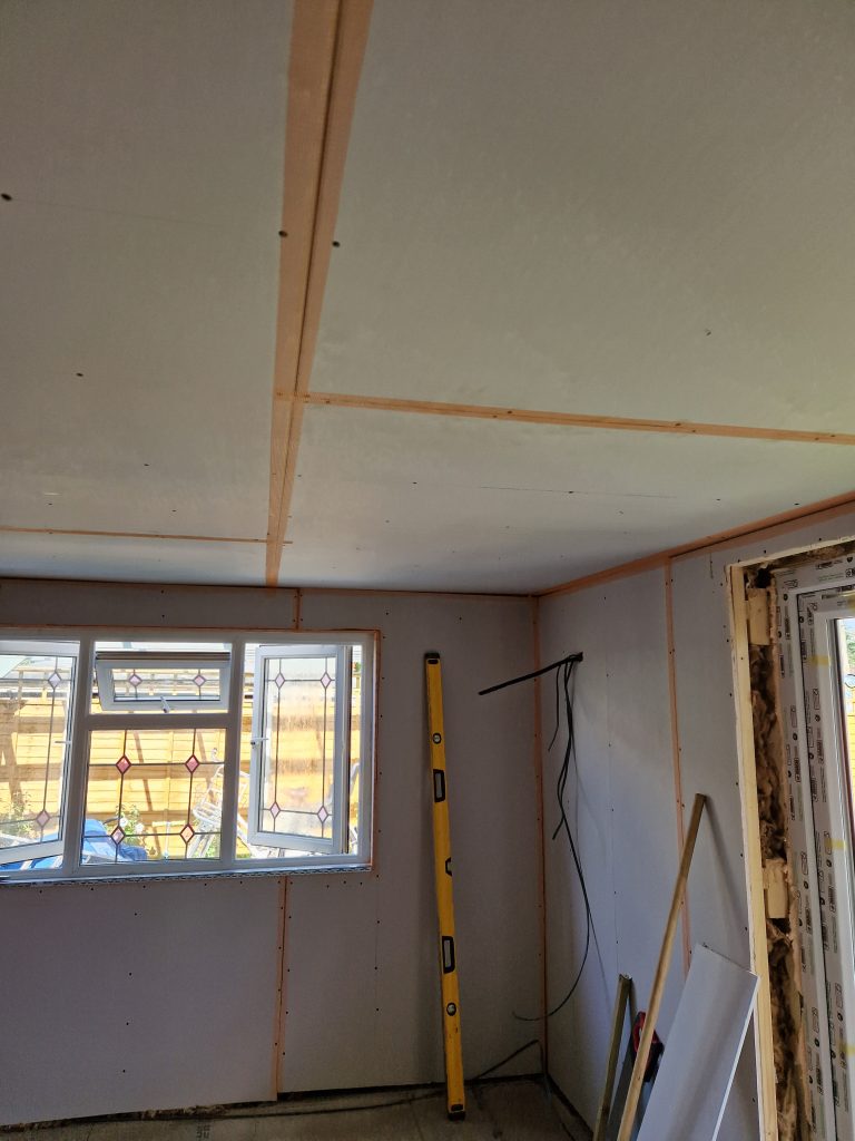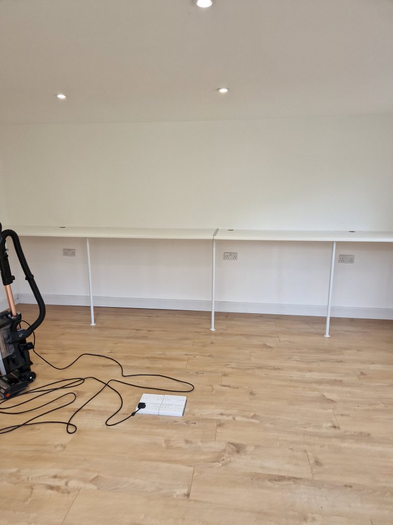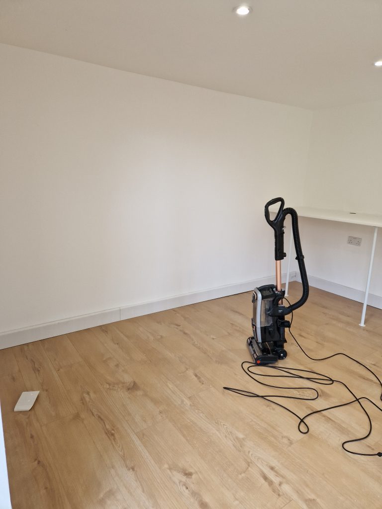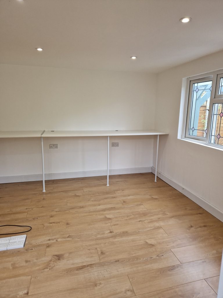 Lake Twins Construction converted this cold and dark garden room, into a warm, bright and airy garden office. Increasing the ceiling height, fully insulating and adding a new electric supply gave the foundation for a great office space. Then plastering, decorating and laying a new floor completed this modern work space which the customer was thrilled with.