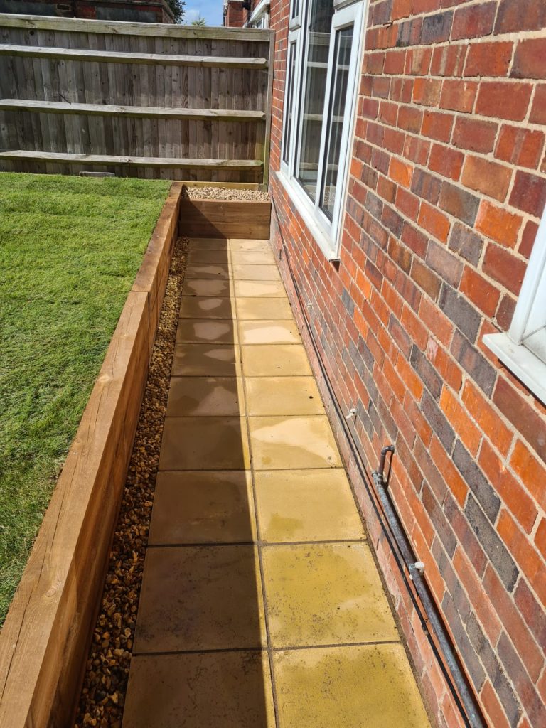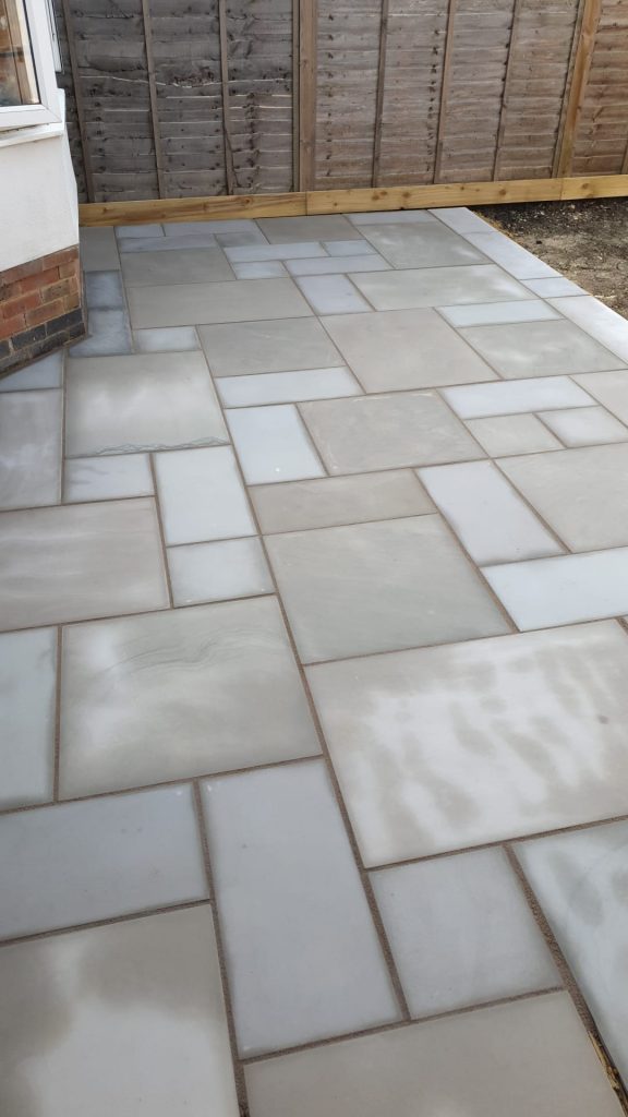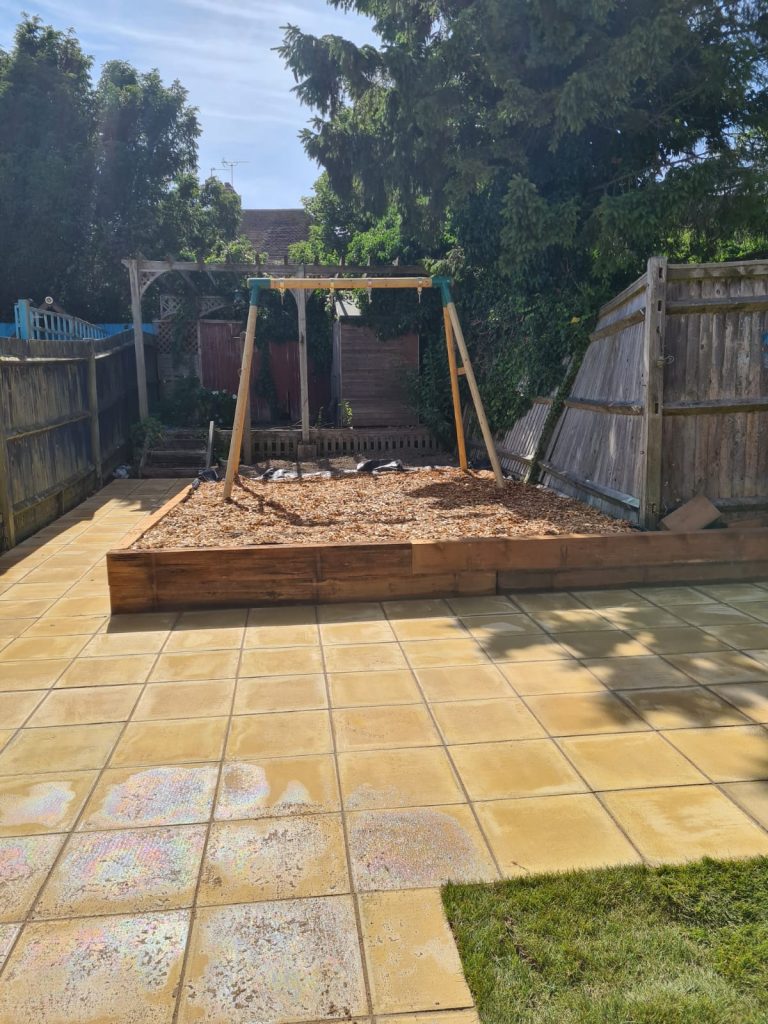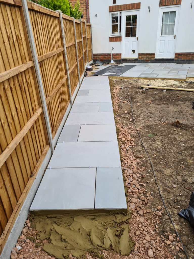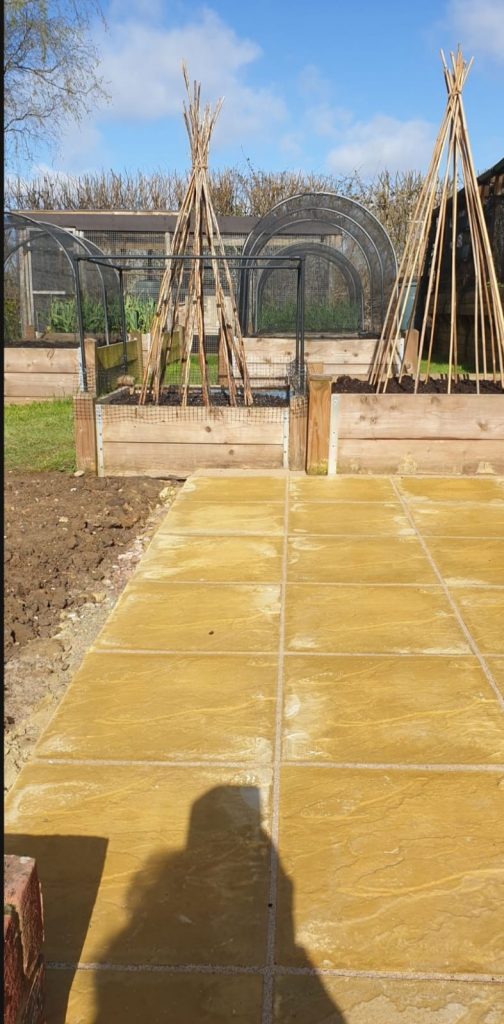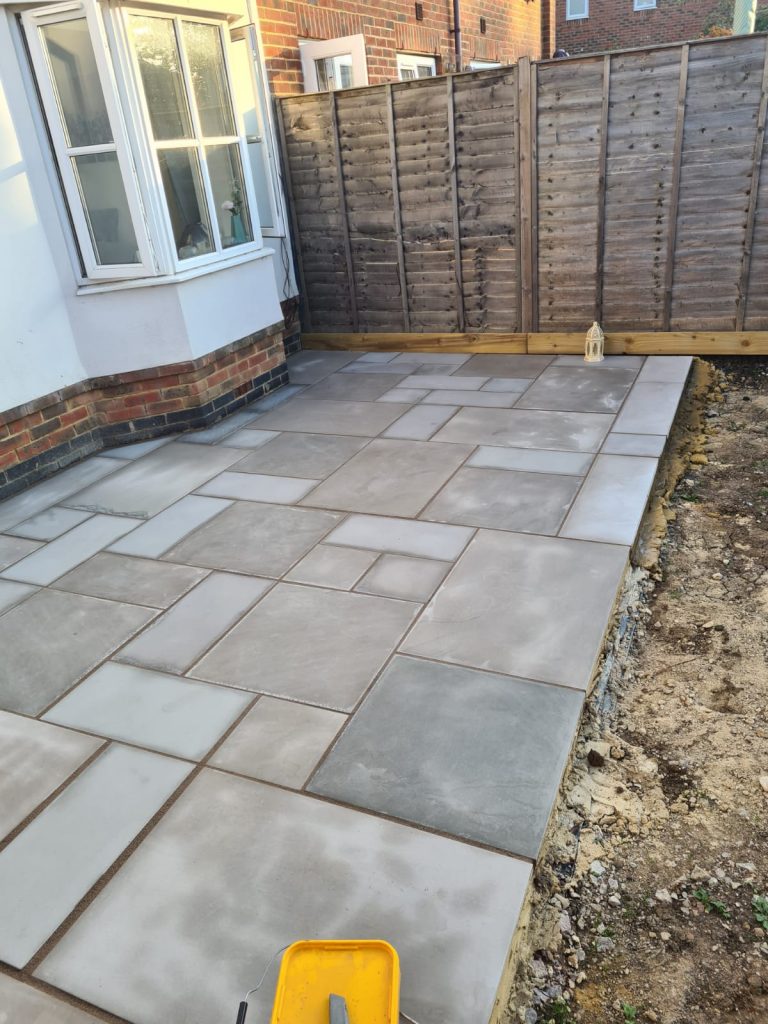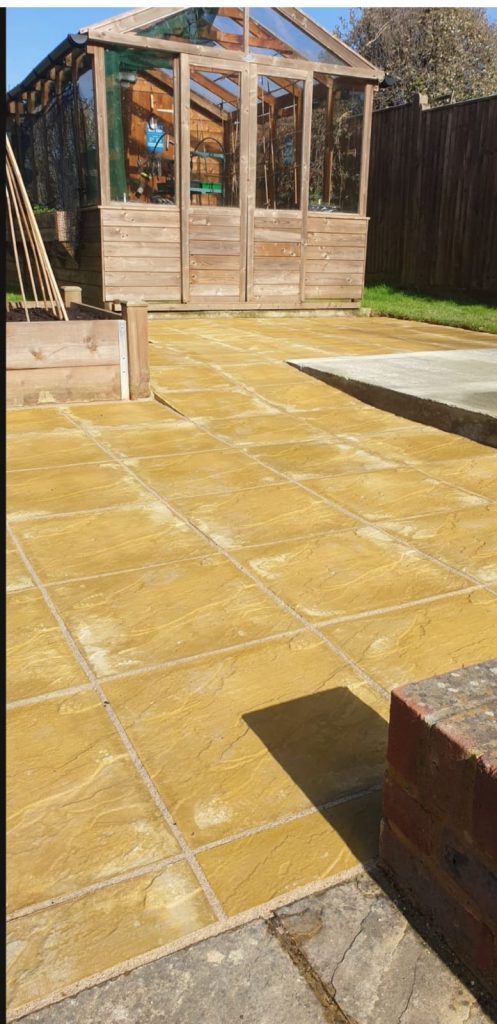 We built a sleek patio with a solid base for a greenhouse in East Sussex. First we cleared the area then dropped a concrete foundation strong enough for heavy greenhouse frames. After that we installed smooth yellow stone paving – clean lines, great finish, all ready for garden life.